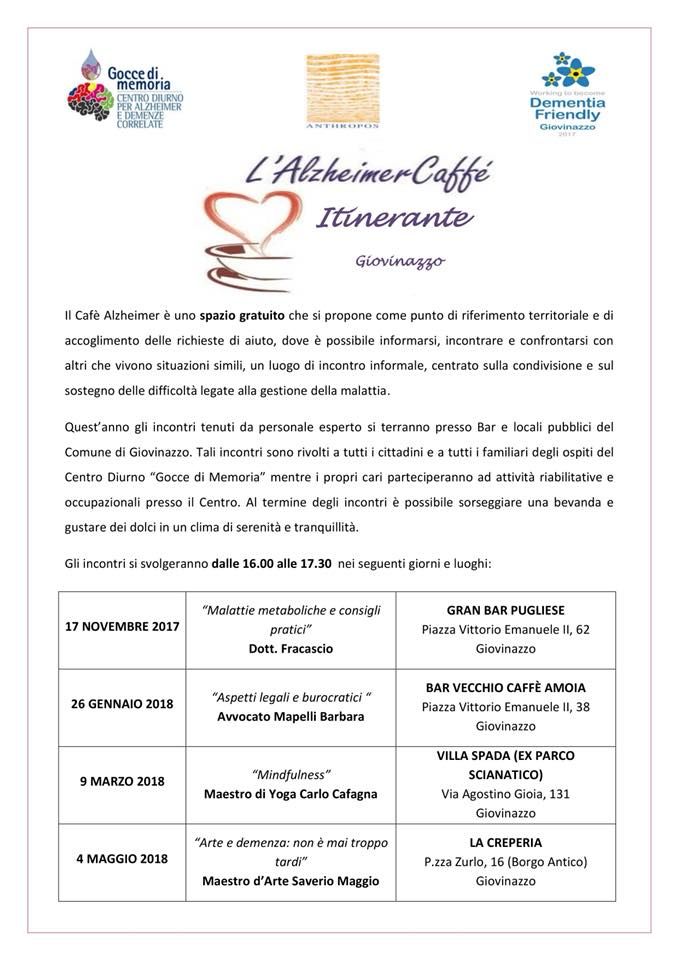 Lo Staff del Centro Diurno Gocce di Memoria informa chiunque volesse partecipare che l'incontro del Cafè Alzheimer previsto il 19 Gennaio 2018 condotto dall'Avvocato Mapelli Barbara "Aspetti legali e burocratici" dalle ore 16,00 alle ore 17,30 c/o Bar Vecchio Caffè Amoia - P.zza Vittorio Emanuele II, 38 Giovinazzo, è rimandato al giorno 26 Gennaio 2018.